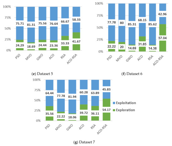 Figure 7 provides exploration-exploitation ratios during the searching process for all MAs on each dataset for 50 iterations. From the bar charts in Figure 7, ACO-RSA maintains better balance between exploration and exploitation for all the seven datasets. Although PSO balanced exploration-exploitation for the first four datasets, it fails to maintain the balance (has high exploitation) for the remaining three datasets. Most other algorithms have shown high exploitation which can either be confirmed through the literature or by analyzing the algorithm design. In standard ACO, ants travel the path iteratively to bring out the best solution, representing higher exploitation than exploration. Standard RSA achieved this balance by splitting the total iteration into four stages, but it failed for four out of seven datasets.