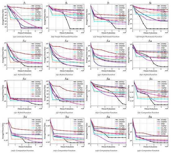 Convergence behavior comparisons between STTPSO and the seven compared algorithms on the 16 50D CEC 2017 benchmark problems.