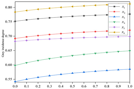 - Step 4 Calculate grey matrix incidence degree between each scheme and ideal scheme. According to Equations (4) and (5), let , the grey matrix incidence degree of each scheme is , , , , , .