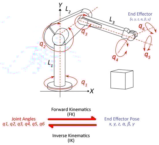 The structure of the manipulator robot is defined by the number of degrees of freedom (DOFs). Each DOF is associated with a robot joint, and each joint represents a joint variable. The pose (position and orientation) of the end-effector can be computed from the joint variables, this process is known as forward kinematics, see Figure 2. The opposite problem is known as the inverse kinematics problem which consists of the computation of the joint variables that correspond to a desired position and orientation. In the case of forward kinematics, a configuration of joint variables produces a unique pose. On the other hand, the inverse kinematic problem is more complex since there can be multiple joint configurations for the same pose. In the case of redundant robots, there can be infinite solutions. The equations to solve the inverse kinematics are in general nonlinear, and therefore is not always possible to find a closed-form solution.