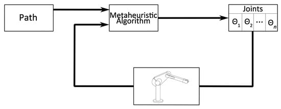 In Figure 3, we summarize the proposed approach for manipulator trajectory tracking. The proposed approach uses Algorithm 1 to follow the desired path. This algorithm, requires the computation of the inverse kinematics (Algorithm 2). To solve the inverse kinematic problem Algorithm 2 uses a metaheuristic algorithm, which objective is to find the best joint variables that minimize the cost function (17).