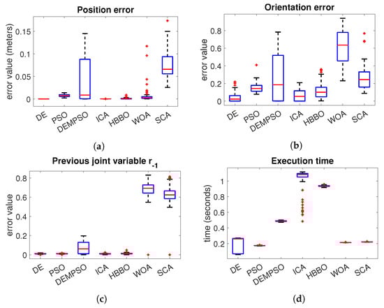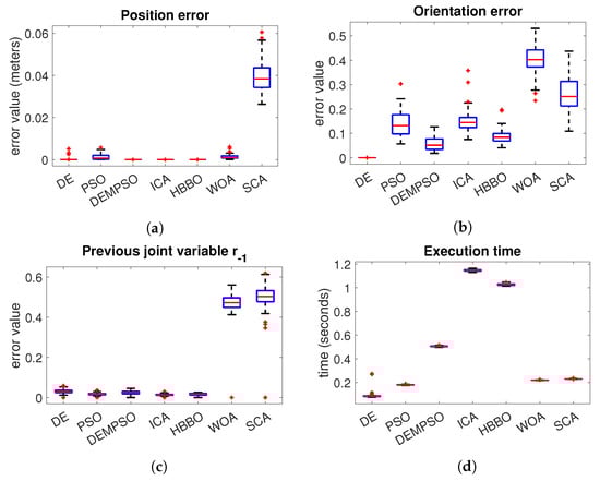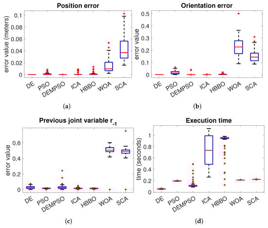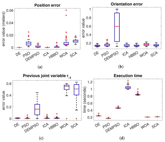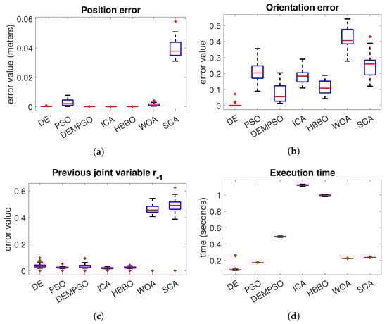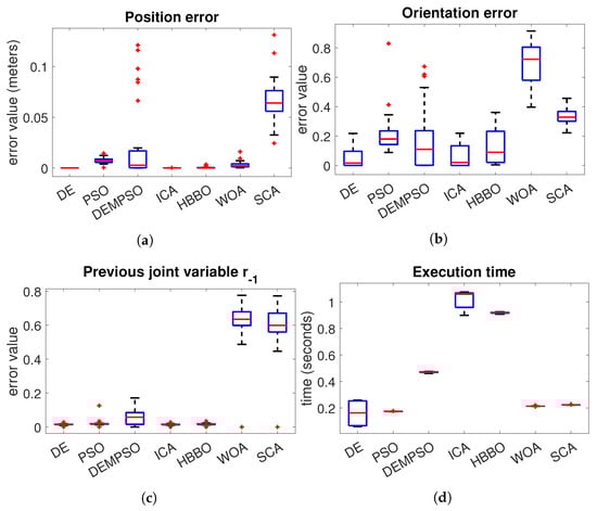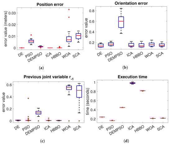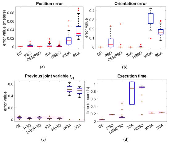 In the case of the Fanuc robot Figure 6a, we can notice that DE, ICA and HBBO have the best performance in the position error. With respect to the orientation error Figure 6b, the algorithm with the best performance is the DE. In the joint variables error Figure 6c, we have a very similar performance between the algorithms DE, PSO, ICA and HBBO, where the median of the DE is slightly lower. The algorithms with the worst performance are the WOA and SCA, which are the algorithms with the highest median error. In the execution time Figure 6d, the DE and PSO have the lowest median, where PSO has the lowest distribution. However, DE evolution performs better than PSO in the position and orientation errors.