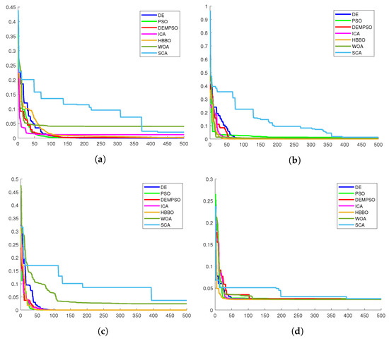 In the ICA algorithm, the number of imperialists is 10, the selection pressure 1, and the assimilation coefficient . Finally, the parameters settings for the HBBO algorithm are: amplification factor , cross-over , the maximum immigration and emigration are 1, the predetermined maximum mutation probability is . For the case of the WOA algorithm, the parameter a is linearly decreased from 2 to 0. For the SCA the parameter a is set to .
