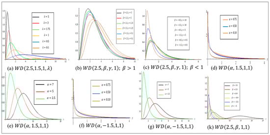 Figure 1 gives sample plots of the Whittaker probability density function for different values of the relevant parameters. We first note that is a scale parameter as exhibited in Figure 1. In Figure 1b–k, we fix .