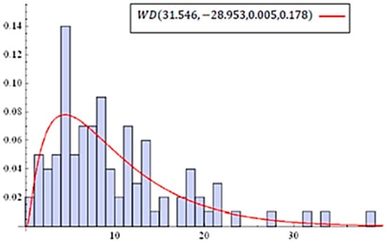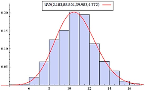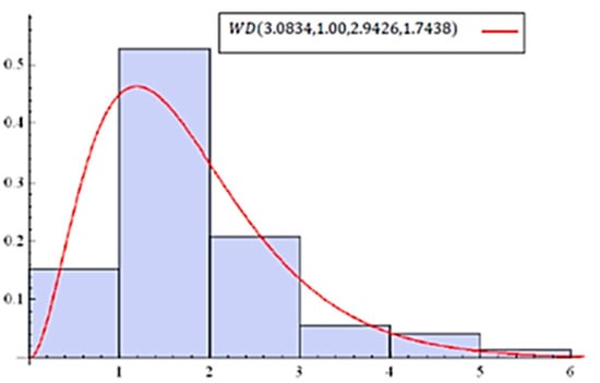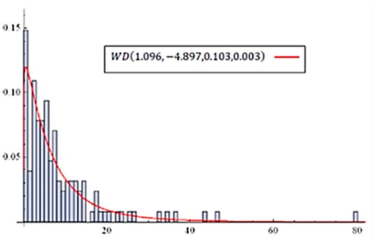 From the plot in Figure 1b, when , we note that the change in the value of has a negligible effect on the shape of the Whittaker probability density function. In Figure 1c, when , note that the change in the value of is taken as a scale parameter, and has a greater effect when . For (), the distribution peaks further as increases (decreases). In Figure 1d–k, we fix . For , the Whittaker pdf attains ∞ and decreases sharply to zero as shown in Figure 1d,f. In Figure 1e,g, as the value of decreases, the distribution peaks more.
