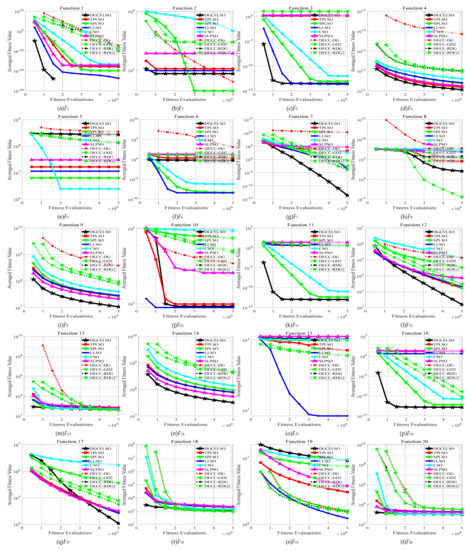 - Instead of using historical evolutionary information, such as the historically global best position (gbest), the personal best positions (pbest), and the neighborhood best position (nbest), in traditional PSOs [18,47], the devised DGCEL employs the elite particles in the current swarm to direct the learning of the non-elite particles. In contrast to the historical information, which may remain unchanged for many generations, particles in the swarm are usually updated generation by generation. Therefore, in the proposed DGCEL, the selected two guiding exemplars are not only likely different for different particles but also probably different for the same particle in different generations. This is very beneficial for the promotion of swarm diversity.