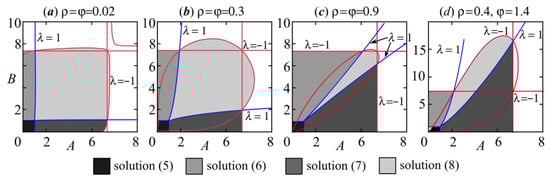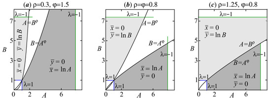 As can be seen, the higher the values of parameters ρ and φ, the wider the stability areas (Figure 1). Note that semitrivial solutions (6) and (7) with their stability domains exist for any values of the parameters ρ and φ. Higher values of the parameters ρ and φ significantly expand the stability regions of solutions (6) and (7), respectively (Figure 1a,b). Based on ρ = β/δ and φ = γ/α, the growth of ρ and φ values may be caused by higher values of the parameters β and γ, characterizing competitive influence on the species x and y, respectively, or lower values of the parameters δ and α describing the self-regulation. Therefore, the lower the self-limitation in population y relative to its competitive impact on species x, the wider the range of demographic parameter values under which species y displaces x. The converse is also true; a growth of φ values increases the survival chances of species x. If ρ = φ, then the stability domains of both semitrivial fixed points are equal in area and symmetric with respect to the quadrant bisector (Figure 1b). For φρ < 1, the stability areas of semitrivial fixed points do not intersect (Figure 1a,b); for φρ = 1, they have the common boundary A = Bρ (Figure 1c); for φρ > 1, their stability regions overlap. Figure 2 shows the overlapping of stability areas of solutions (6) and (7) with φρ > 1 when φ = 2.5 and ρ > 0.4.