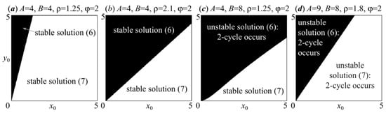 Figure 4 shows the stability regions of solutions (5)–(8), given by the above bifurcation boundaries with φρ < 1. At ρ = φ, the stability domain is symmetric with respect to the quadrant bisector. The stability loss can occur only through a cascade of period-doubling bifurcations, which coincides with the results obtained in [34,48,62,68]. On the whole, higher values of parameters φ and ρ are seen to narrow the stability region of nontrivial fixed points and to expand those of semitrivial solutions.