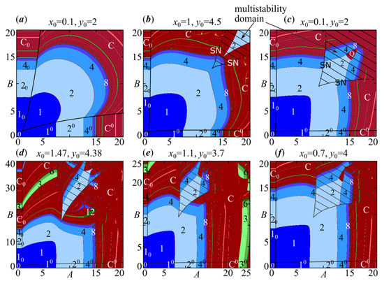 Dynamic mode maps allow us to study model (4) stability domains of fixed points and emerging bifurcations due to changing values of parameters. Maps are generated as follows: 10,000 iterations of map (4) are calculated at each point (corresponding to a pixel) in the plane of parameters and the last 500 iterations are used to determine the cycle period of system (4), then this point is painted in a specific color according to the found period. Using the dynamic mode maps is the well-known approach in the study of dynamic systems, e.g., [78].