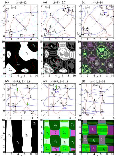 With a further change in the values of parameters A and B, the second eigenvalue of system (4) passes through –1, and an unstable out-of-phase 2-cycle occurs in the vicinity of the fixed point (Figure 6a). This transition corresponds to a subcritical period-doubling bifurcation of the unstable nontrivial point, which results in the appearance of two symmetrically located saddle points . Note that they are not located symmetrically with or (Figure 6d–f), but the mechanism of their occurrence does not change significantly. Before the out-of-phase 2-cycle in system (4) becomes stable, a series of bifurcations occurs, which leads to the appearance of other periodic points and dynamics complications; let’s look at them in more detail.