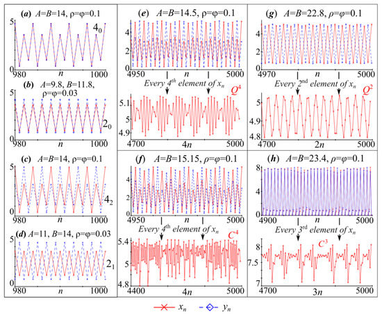 Examples of regular (a–d) and irregular (e–h) dynamics of system (4). 20 and 40 is in-phase oscillations xn and yn with period 2 and 4, 21 and 42 is out-of-phase oscillations. Q and C are quasiperiodic and chaotic out-phase dynamics.