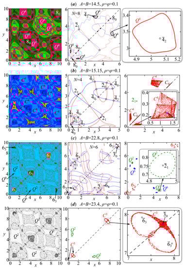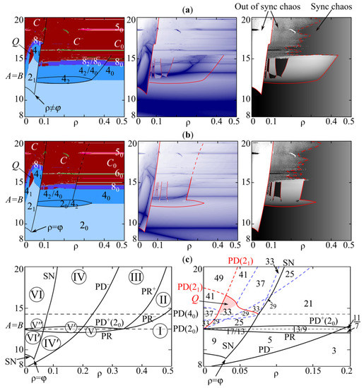 Afterwards, the described types of dynamics are complicated due to the “pure” sequence of period-doubling bifurcations of in-phase modes and the Neimark–Sacker bifurcation (the birth of a torus) of the out-of-phase 4-cycle. Here we observe scenarios that are in good agreement with those described, for example, in [55,57,81,83,84]. With the Neimark–Sacker bifurcation of the out-of-phase 4-cycle, four closed invariant curves denoted as Q4 appear around points 42; and they coexist with the in-phase cycles emerging due to the cascade of period-doubling bifurcations of point 40 (Figure 8a).