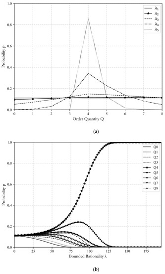 In order to characterize retailer’s bounded rationality, we introduced logit choice probability model to construct retailer’s bounded rationality and obtained the QRE. In such a logit choice model, the rationality of retailers is reflected by a bounded rationality parameter , which would be adjusted dynamically during the convergence of quantal response equilibrium to Nash equilibrium (assume that the NE is always in the feasible strategy set). Instead of a specific order quantity, in the framework of QRE, a retailer’s ordering decision is a probability distribution—that is, all order quantity within the upper and lower limits of demand are likely to be chosen. For any positive bounded rationality parameter , all feasible order quantities are chosen with positive probability, and the order quantity with higher expected profit is more likely to be chosen. The value of parameter can reflect the degree of retailer’s bounded rationality. When the parameter , retailer ’s ordering decision follows uniform distribution over the feasible domain, that is, retailer does not obtain any information about the optimal order quantity and stochastically selects between each order quantity with equal probability, which means that retailer is completely irrational. When the parameter , retailer becomes perfectly rational and would definitely choose the theoretical optimal order quantity, which is consistent with the order quantity predicted by Nash equilibrium.