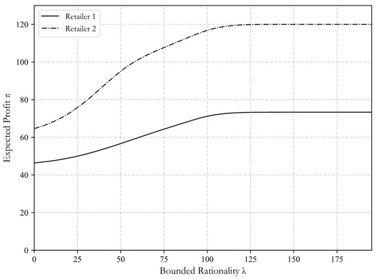 Figure 6 shows the relationship between expected profit and bounded rationality parameter. With the increase of bounded rationality parameter, the expected profit of both retailers will increase. Retailers become more and more rational, and the order quantity is closer to the optimal order quantity, so their expected profit is also close to the optimal profit. When , the expected profit of retailer 1 and 2 is close to the optimal value of 73.3 and 120, respectively. The profit variation trend of the two retailers conforms to the principle of decreasing efficiency of the learning curve, and this learning effect is consistent with the learning effect found by Bostian et al. [21] in the behavioral experiment of the newsvendor model.