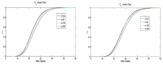 On the one hand, the behavior of the cumulative distribution functions (CDFs) of , , is analyzed in both cases in terms of the sample size. For that, and through Montecarlo simulations, 2000 values of the statistics , , have been generated for . The corresponding empirical CDFs are displayed in Figure 1. At a glance, this figure shows the rapid convergence of the empirical CDFs to the target chi-squared distributions.