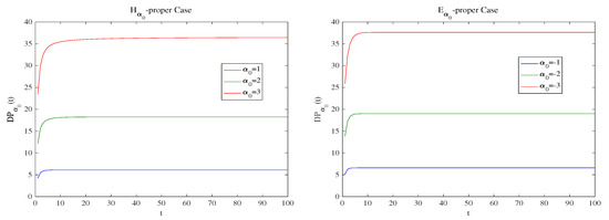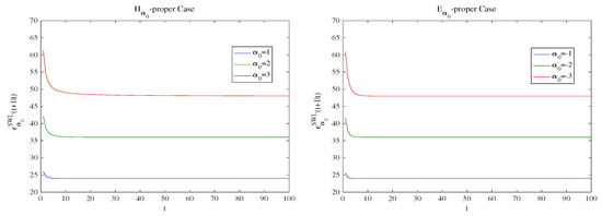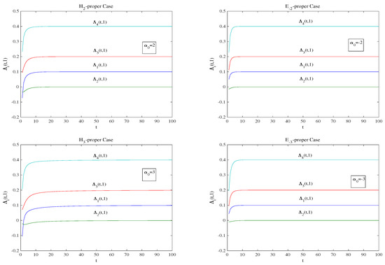 Two scenarios are contemplated: in the first one, we consider that and in , and three different hyperbolic quaternion algebras are studied (). In the second one, we set the value of the parameters and to be both 0 and three elliptic quaternion algebras are analyzed (). These scenarios present an interesting characteristic: from Proposition 1, is either -proper (in scenario 1) or -proper (in scenario 2); however, the degree of improperness of in the HQ system increases as grows.