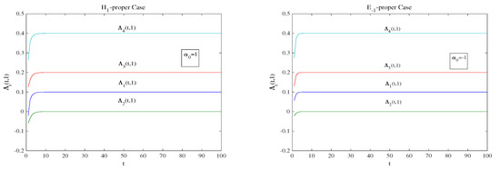 Finally, Figure 4 displays the convergence performance of the components of given in (26). As could be expected from (27), we also obtain here a rapid convergence toward the target values and, in general, this convergence is slightly slower as grows as well as in the -proper case.