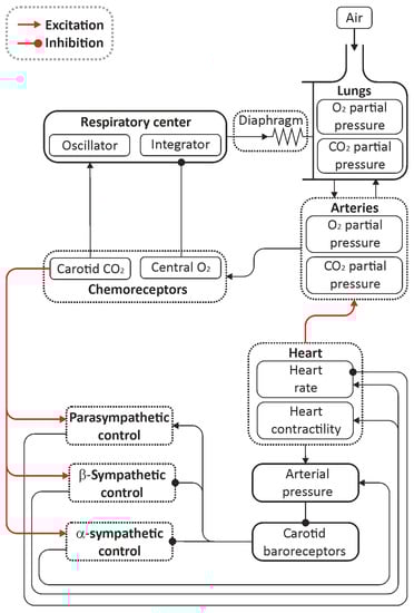Earlier, we used a mathematical model to investigate the contributions of the deterministic chaotic dynamics of the autonomic control, noises of a central origin and the irregularity of respiration to the complexity of the heart period [20]. The model we investigated in [20] was proposed from the “first principles”, and we consider it an adequate representation of the cardiovascular system because it previously simulated several important effects, including a passive orthostatic test [53], arterial hypertension [54], blockade of the autonomic control [54] and cardiorespiratory synchronization [54]. However, this model has one important limitation: it is a simplified model of respiration. We modeled the respiration using a sinusoidal signal, and the model supported two types of respiration: with a constant frequency, or with a randomized, normally distributed frequency of respiration. The model did not account for the regulation of respiration, and because of that, the cardiorespiratory coupling was only one-directional.