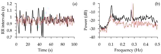 Time series (a) and Fourier power spectra (b) for the model RR intervals. The black bold lines correspond to a healthy subject, and the red thin lines correspond to the simulation of the blockade of the regulation of respiratory amplitude and frequency.