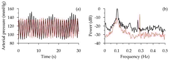 Time series (a) and Fourier power spectra (b) for the model aortic arterial pressure signal. The black bold lines correspond to a healthy subject, and the red thin lines correspond to the simulation of the blockade of the regulation of respiratory amplitude and frequency.