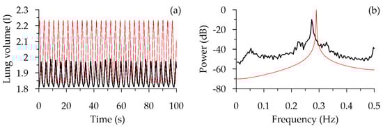 Time series (a) and Fourier power spectra (b) for the model signals of lung volume. The black bold lines correspond to a healthy subject, and the red thin lines correspond to the simulation of the blockade of the regulation of respiratory amplitude and frequency.