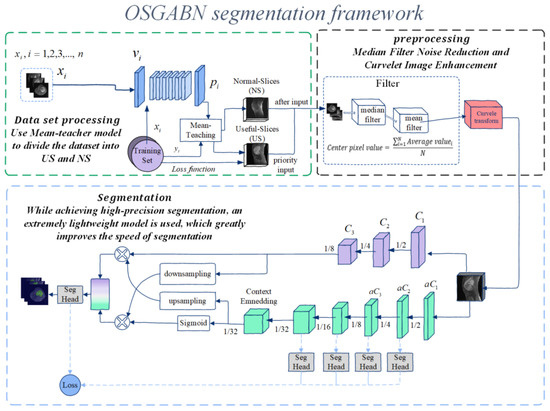 The overall architecture of (OSNDCN) is reflected in Figure 1, and in the first part, the MRI image is divided. This part mainly includes three structures which use the mean-teacher model to divide the original data set, preprocess the data set for noise reduction and data enhancement, and divide the bilateral network.