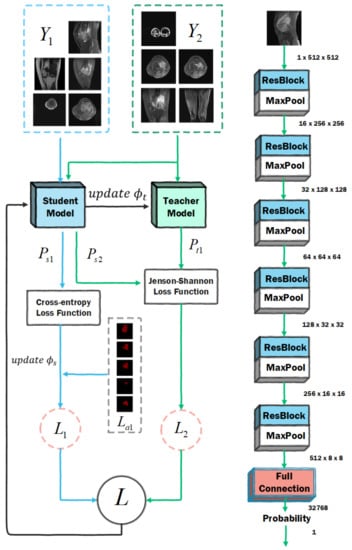 - The loss value of the student model is , the update parameter using this gradient descent is , and the teacher network updates the parameter by moving average to , and the update process is expressed by the Equation (2).