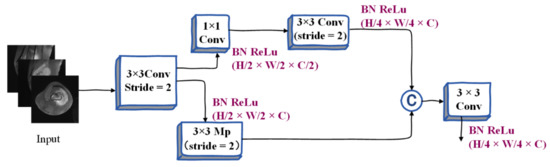 Considering the large receptive field and higher computational efficiency, after referring to the characteristics of other lightweight MRI image segmentation models, we design a semantic branch. The semantic branch model adopts a fast downsampling strategy to improve the feature representation level, rapidly expands the acceptable field for MRI image segmentation, and the lesion area can be determined quickly. High-level semantics require large receptive fields, so the semantic branch adopts methods such as global average pooling, embedding global contextual responses, etc. It mainly includes the stem block structure. We use stem as the first stage of the semantic branch. This process uses two different downsampling methods to reduce the feature representation and then concatenates the output features of the two branches as the output. It has low computational cost and effective feature expression ability, and its design structure is shown in Figure 3.