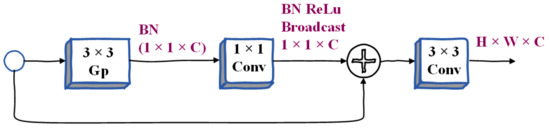 Context Embedding Block. As described above, the semantic branch requires large receptive fields to capture high-level semantics, so we design the context embedding block, which uses global average pooling and residual connection methods to efficiently embed global context information. The schematic diagram of its architecture is shown in Figure 4, where Conv represents convolution operation, BN represents batch normalization, ReLu represents relu activation function, Mp refers to max pooling, and Gp refers to global average pooling. C represents the connection, 1 × 1 and 3 × 3 represent the size of the nucleus, and H × W × C represents the shape of the tensor during the segmentation of the osteosarcoma MRI image. The three parameters represent Height, Weight, and Channel, respectively.
