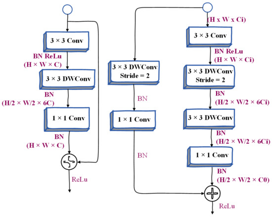 - The 1 × 1 network can be used as a projection layer to project the output of the depth-wise convolution to the space with low channel capacity. When stride = 2, we will use two 3 × 3 depth convolutions to further expand the receptive field, and a 3 × 3 separable convolution is used as a shortcut. Many people use a 5 × 5 separable convolution to expand the receptive field. Under certain conditions, its FLOPS will be better than two. There are fewer 3 × 3 separable convolutions. But in this layer, we use two 3 × 3 depthwise convolutions instead of 5 × 5 depthwise convolutions. Because this structure has fewer FLOPS and the same receptive field in our model, the model becomes more lightweight.
