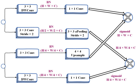 In order to merge the feature responses of the above two branches, researchers will adopt many methods, including a summation of elements, connection, etc. However, the outputs of the two branches have different levels of feature representation. Therefore, using a simple combination method will ignore the diversity of the two kinds of information, which will make the performance worse and the optimization difficulty will become higher. Based on our observations and experiments, we finally propose a bilateral guided aggregation layer, which uses this novel hierarchical structure to fuse the complementary information of the two branches above, as shown in Figure 6. This layer utilizes the context information of the semantic branch to guide the feature response of the detail branch. With different scale guidance, we capture different scale feature representations to inherently encode multi-scale information, while compared with the simple combination method, this bootstrapping method can make the communication between the two branches more efficient. In Figure 6, Conv is the convolution operation, DW-Conv refers to the convolution in the depth direction, aPooling refers to average pooling, BN refers to batch normalization, US refers to bilinear interpolation, and Sig refers to the sigmoid activation function. Sum refers to summation, 1 × 1, 3 × 3 represents the size of the kernel, H × W × C represents the shape of the tensor, and the three parameters represent Height, Weight, and Channel, respectively.