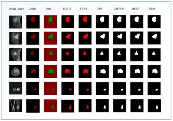 Figure 9 shows the effect of each model on the segmentation of osteosarcoma MRI images. Among them, from left to right are the segmentation renderings of the label image, our model, FCN16, FCN8, FPN, MSFCN, MSRN, and U-net. We can visually compare the performance differences of the models through the segmentation effects of each model. According to the comparison of the selected six osteosarcoma segmentation instances, it can be seen that our model has a good segmentation effect and can more accurately divide the lesion area, while other models may have insufficient segmentation (such as MSFCN) and excessive segmentation, partitioning (such as FPN) and other issues.