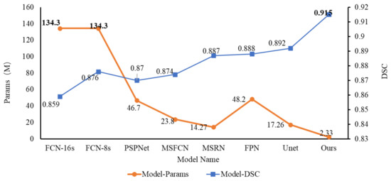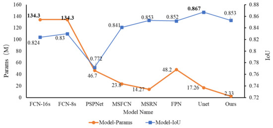 Figure 11 depicts a legend for the comparison of the IoU and the parameter scale for different models. From the figure, we can see that the IoU of each segmentation model is relatively high. Except for PSPNet, the IoU of other models is above 0.8. And the IoU of our FaBiNet is second only to Unet; the former is 0.853, and the latter is 0.867. The difference between the two is also very small. However, we can see from the figure that under the premise that the IoU gap is not large, the params gap of each model is more obvious. Among them, our model param is only 2.33 M, and the parameter value of Unet whose IoU is slightly higher than that of FaBiNet is 17.26 M. For example, with FCN, when it reaches an IoU of about 0.83, the parameter scale reaches an astonishing 134.3 M, which means that the model is too complicated, so it is not conducive to practical use.