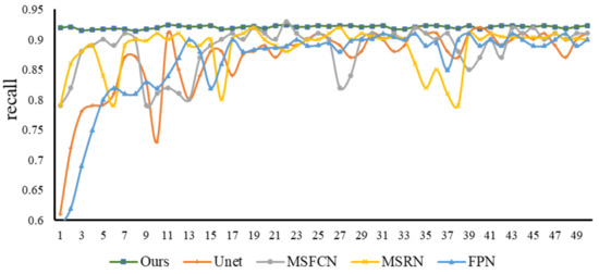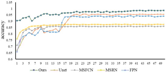 Figure 12 below shows how the accuracy of each model’s changes as training progresses. We trained a total of 1000 epochs, and randomly selected 50 epochs (20 random epochs to choose one epoch) for comparison and analysis. It can be seen from the line chart that after 200 rounds of training, the accuracy of each model tends to be stable; numerically, the accuracy rate of our FaBiNet is the highest, reaching 96% in steady state, and the highest accuracy is more than 98%. The accuracy rate and stability are both at an excellent level. In terms of accuracy, the ranking of each model is: FaBiNet (Ours) > UNet > FPN > FCN-8s ≈ FCN-16s > MSRN > MSFCN.