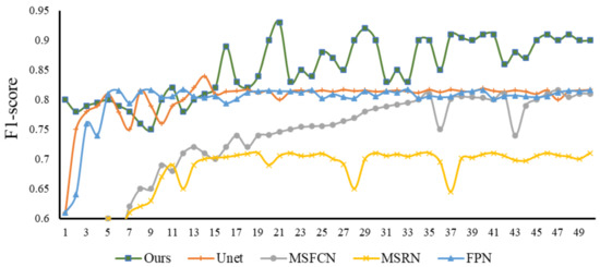 Recall is an important evaluation index in tumor image recognition. If the recall fluctuation of a model is relatively small and the value is high when it is stable, then this model not only has a high recognition rate, but also avoids the occurrence of missed diagnosis as much as possible. From Figure 13, we can observe the recall trends and values of various models. We can see that in the first 220 epochs of training, the recall fluctuations of the Unet, FPN, and MSFCN models are relatively large. After that, most of the models have stabilized. Generally speaking, the recall of our model is relatively high and relatively stable, and there will be no big fluctuations in the early stage, so the performance is excellent. Subsequently, we selected the same four models to compare with our model and study their F1-score relationship. From Figure 14 of epoch—F1-score, we can see that the F1-score of our model is always kept at a high level, and the stability is also better, which indicates that our model has better robustness.