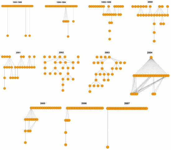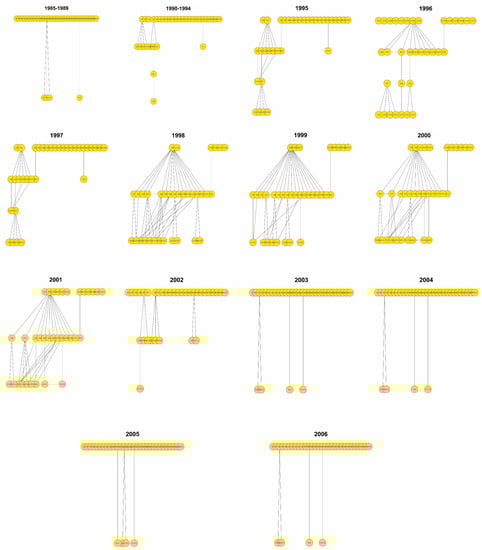 The four organizations show distinctive hierarchical structural changes in time. More specifically, a change in centralization is observed during terrorist actions (2004 for “Jamaah Islamiah section of Indonesia”, Figure 1; during 1998–2001 for “Hamburg Cell”, Figure 2; in 2003 for “Al-Qaeda section of Madrid”, Figure 3; during 2000–2003 for “Jamaah Islamiah section of Philippines”, Figure 4). The changes are also assessed via the presence of distinct roles. It is scientifically interesting and useful for law enforcement authorities to examine whether periods of high values or abrupt changes in the network indicators (Section 3) are associated with actual terrorist activities.