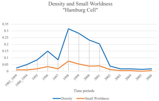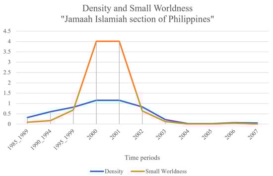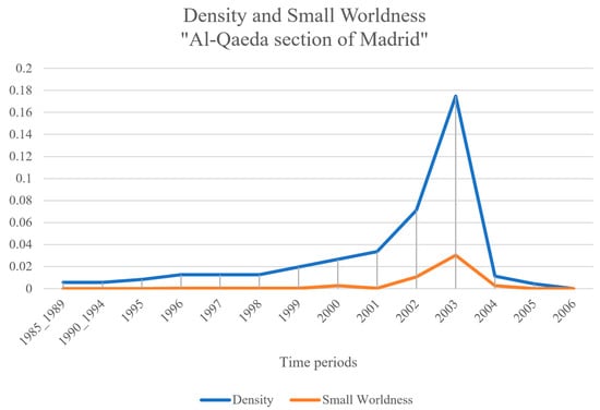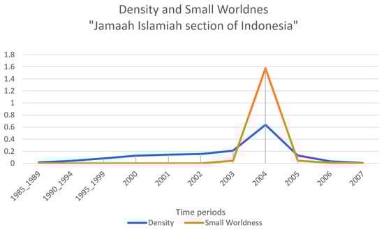 The evolution of the values of density and small worldness indicators are presented for the networks of the four terrorist organizations, namely: “Jamaah Islamiah section of Indonesia” (Figure 5), “Hamburg Cell” (Figure 6), “Al-Qaeda section of Madrid” (Figure 7) and “Jamaah Islamiah section of Philippines” (Figure 8).