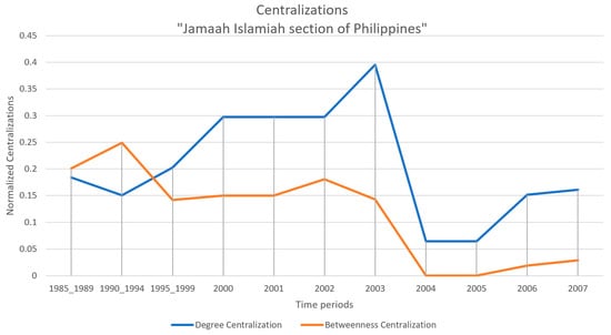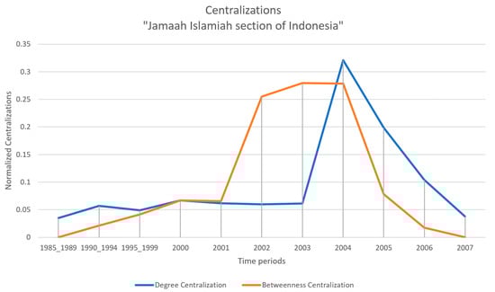 Temporal development of degree and betweenness centralizations for the “Jamaah Islamiah section of Indonesia”. Both indices increase, reaching a maximum in 2004, and then decrease. Degree centralization increases rapidly after 2003, and then decreases. Betweenness centralization increases rapidly two years earlier, i.e., after 2001, and then decreases rapidly.