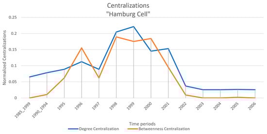 Temporal development of degree and betweenness centralizations for the “Hamburg Cell”. Both indices fluctuate, with three maximum values. The first maximum appears in 1996 for both centralizations; the second maximum appears in 1997 for betweenness centralization and one year later for degree centralization, and the third maximum appears in 2000 for betweenness centralization and one year later for degree centralization.