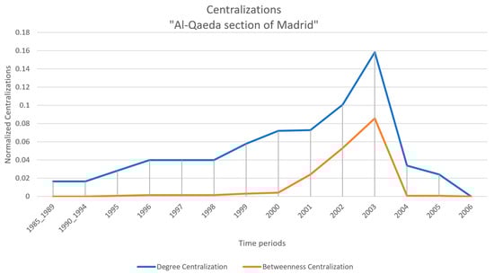 Temporal development of degree and betweenness centralizations for the “Al-Qaeda section of Madrid”. Both indices increase, reach a maximum in 2003, and then decrease. In the period 2000–2001, degree centralization reaches a small plateau, while betweenness centralization increases. Both indices rapidly decrease after 2003.