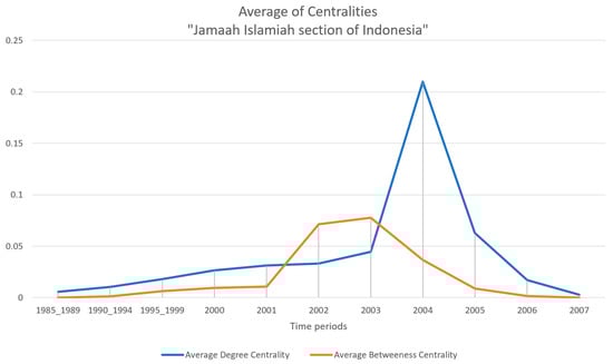 Temporal development of average degree centrality and average betweenness centrality for the “Jamaah Islamiah section of Indonesia”. Both indices increase, reach a maximum and then decrease. The average degree centrality reaches its maximum in 2004, while the average betweenness centrality does so in 2003.