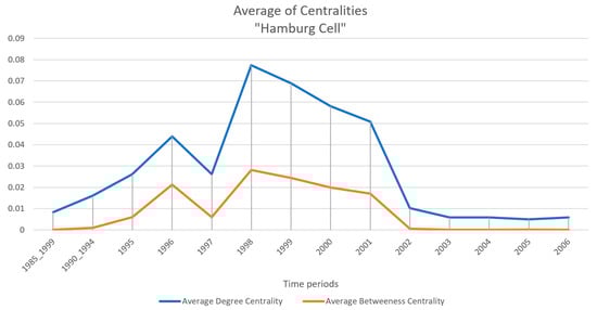 Temporal development of average degree centrality and average betweenness centrality for the “Hamburg Cell”. Both indices fluctuate, with two maximum values in 1996 and 1998. Both indices decrease rapidly after 2001.
