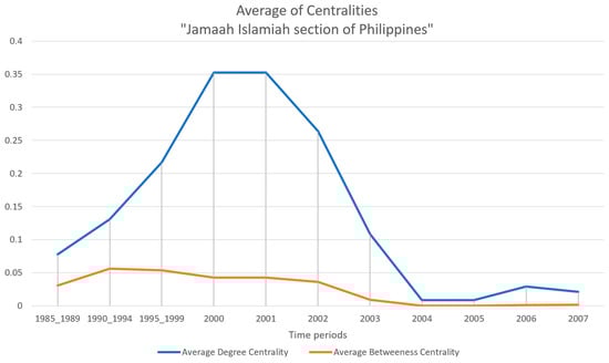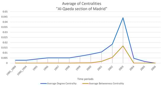 The evolution of the values of the average degree and average betweenness centralities are presented for the networks of the four terrorist organizations, namely: “Jamaah Islamiah section of Indonesia” (Figure 13), “Hamburg Cell” (Figure 14), “Al-Qaeda section of Madrid” (Figure 15) and “Jamaah Islamiah section of Philippines” (Figure 16).