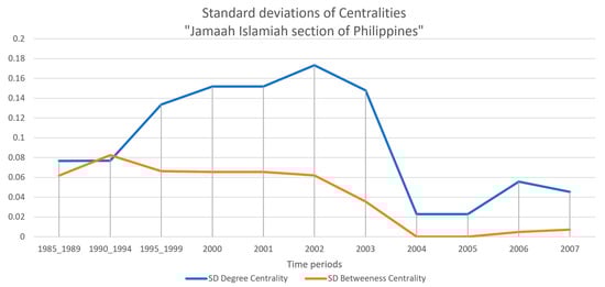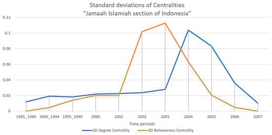 For the organization “Jamaah Islamiah section of Indonesia”, as clearly shown by Figure 5, the density and small worldness indices peak in the year 2004. Their growth shows a rapid increase immediately after 2003 and a rapid decline after 2004. The same is true of the centralization of degree and betweenness centralities indices, which are depicted in Figure 9. An interesting observation is that betweenness starts increasing earlier than the increase in degree, as confirmed for centralization (Figure 9), for average centralities (Figure 13), and for the standard deviation of centralities (Figure 17). It is clear that distinct roles become more pronounced after 2001, peaking in 2004 and rapidly decreasing afterwards.