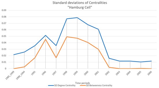 Temporal development of the standard deviation of degree centrality and the standard deviation of betweenness centrality for the “Hamburg Cell”. Both indices fluctuate, with two maximum values in 1996 and 1998. Both indices decrease rapidly after 2001.