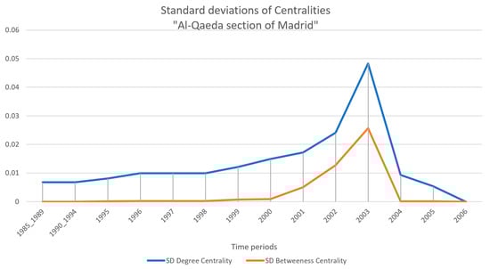 For the organization “Al-Qaeda section of Madrid”, the density and small worldness peak in 2003, and are rapidly decreasing afterwards (Figure 7). Both the degree centralization and the betweenness centralization reach their maximum in 2003 (Figure 11). As the degree centralization reaches a small plateau in 2000–2001, betweenness centralization continues to grow. Immediately after 2003, both indicators decrease rapidly. The average centralities and the standard deviation of centralities increase rapidly up to 2003, and then also decrease rapidly (Figure 15 and Figure 19). It is clear that distinct roles appear in 2003, then the presence of roles rapidly decreases.