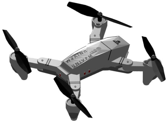 which contains the principal moments of inertia of the drone. In the above equations, R denotes the attitude of the drone with respect to an inertial reference frame, denotes its angular velocity, the quantities , , denote the angular velocities of the four propellers, the function q denotes the position of the center of mass of the drone, the vector denotes the unit vector , the function denotes the mechanical torque exerted by the thrusters on the drone’s body and several constants represent the physical features of the drone, such as mass, inertial coefficients and propeller efficiency parameters. A graphical rendering of a small drone modeled by Equation (26) is displayed in the Figure 1.