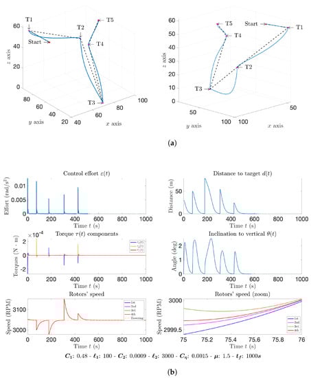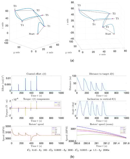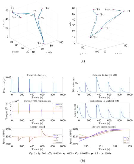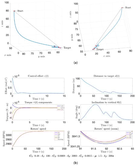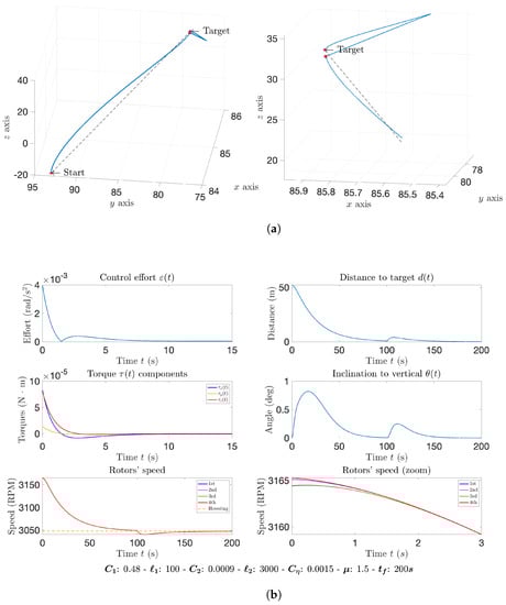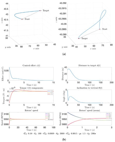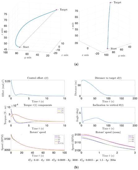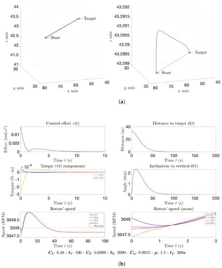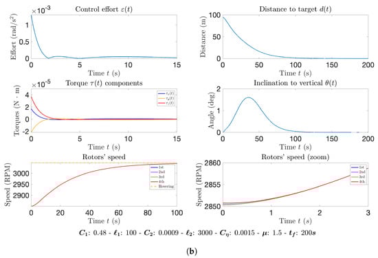 In the simulation whose outcomes are summarized in Figure 10, only one impulsive force acts on the drone. From the target approaching plots it is readily witnessed how, despite the drone has been pushed away by the impulsive force, the controller manages to get the drone on track to a viable journey to the target. At time , when the disturbance happens, the plots show a sudden change in the trend: the distance-to-target panel shows a sudden rise since the drone has been pushed away from its undisturbed trajectory, from the inclination values it is readily noticed that, due to the action of the forcing nuisance, the drone varies its attitude, and from the control effort plot and torque components panel, it is inferred that the controller requests a supplementary effort to the rotors in order to stabilize the drone and steer it back toward the target.