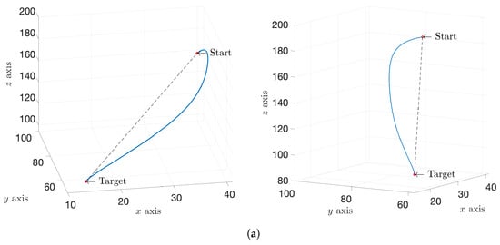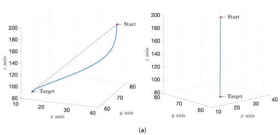 A purely repulsive point with index j is characterized by a coefficient , while a purely attractive point with index j is characterized by a coefficient . In [21], it is set if a point represents a target while the obstacles are usually characterized by . An explanation could lie in the fact that by setting obstacles, it is possible to build a path to guide a moving agent, hence they should attract an agent but, at the same time, the agent must avoid obstacles. In the case of a target, it is advisable to set if an agent should approach that particular target without actually reaching it. (To explain such a choice by a practical example, one may consider the case of a small robot whose goal is to approach a tree while keeping at a reasonable distance from its roots.) In this instance, it is advisable to set . On the other hand, in the case of a quadcopter drone, it is generally allowed to set since a desired attitude does not represent a physical object to avoid. For different kinds of aircrafts, placing a purely repulsive potential at a certain (disallowed) attitude might prove instrumental to allow maneuvering while avoiding bright objects [39].