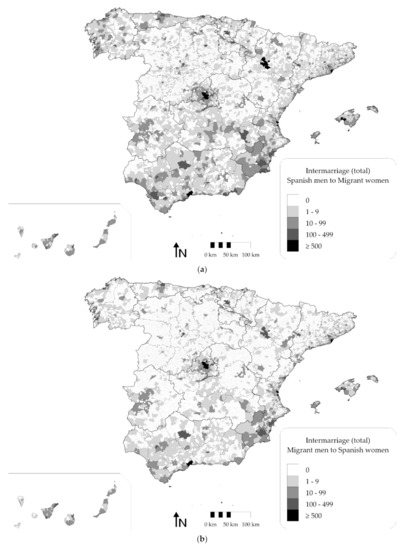 - Rodríguez-García, D.; de Miguel-Luken, V.M.; Solana-Solana, M. Las uniones mixtas y sus descendientes en España: Evolución y consideraciones sobre la mixticidad. Anu. CIDOB Inmigr. 2020, 167–196. [Google Scholar] [CrossRef]
